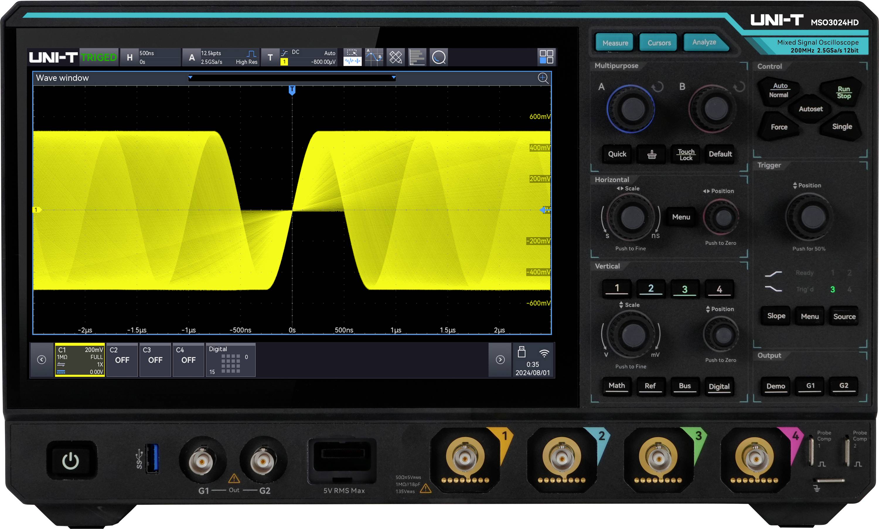 Uni-T MSO3024HD digitální osciloskop 200 MHz, 2.5 GSa/s, 500 Mpts, 12 Bit, 1 ks, 181100300079X